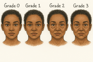 Safir et al. (2024) proposed a standardized clinical grading system to assess the severity of festoons. The scale ranges from Grade 0 to Grade 3, based on the degree of soft tissue fullness and skin folds in the lower eyelid and malar region: