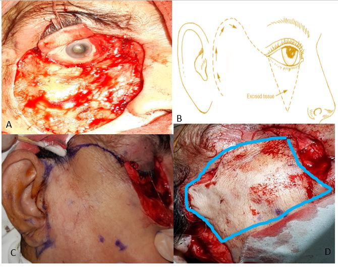 A) Anterior lamellar defect formed after tumor excision(basal cell carcinoma). B,C) Marking of the incision. D)Dissection of the cheek flap in subcutaneous plane