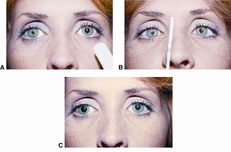 Left Adie tonic pupil. A, The left pupil reacts poorly to a direct light stimulus, whereas the right pupil demonstrates a strong consensual response. B, Both pupils constrict as the patient fixates on a near target. The response of the left pupil to near effort is better than its response to light (light–near dissociation). C, After the patient refixates on a distant target, the right pupil quickly redilates. The left pupil is slow to redilate (it is smaller than the right pupil), a sign of tonicity.