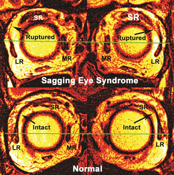 Courtesy of Joseph L. Demer, MD, PhD. Sagging eye syndrome. "This coronal magnetic resonance imaging scan demonstrates inferior “sagging” of the lateral rectus (LR) with rupture of the LR–superior rectus (SR) band bilaterally. The horizontal line depicts the center of the medial rectus (MR) muscle, which intersects the upper pole of the LR muscle"