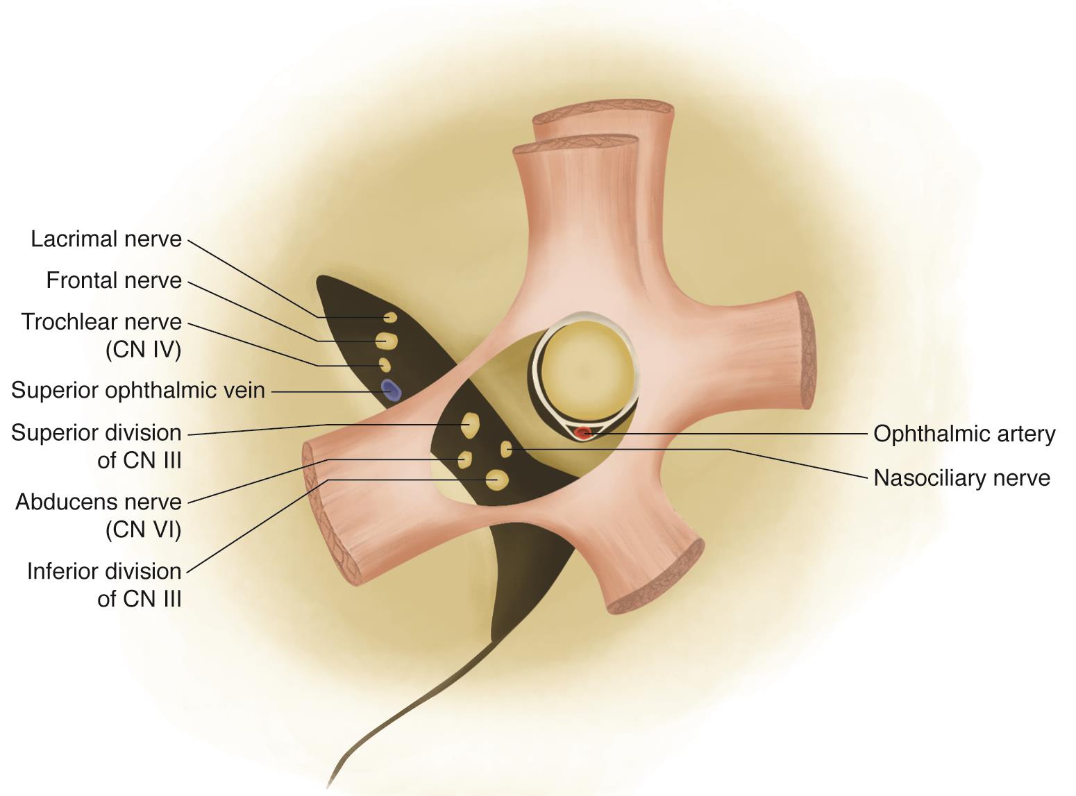 This diagram illustrates the anatomical structures passing through the orbital apex and the superior orbital fissure. It includes key neurovascular components such as the lacrimal nerve, frontal nerve, trochlear nerve (CN IV), superior and inferior divisions of the oculomotor nerve (CN III), abducens nerve (CN VI), nasociliary nerve, ophthalmic artery, and superior ophthalmic vein.