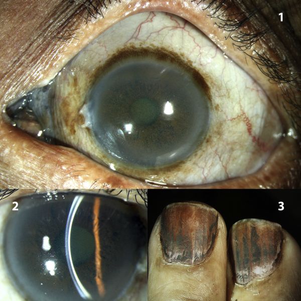 Panigrahi AK, Aruljothi L, Prajna VN. Argyrosis. Ophthalmology. 2017 Sep;124(9):1270. doi: 10.1016/j.ophtha.2017.01.045. PMID: 28823345. Discoloration of the caruncle, corneal haze, posterior corneal stromal opacity, and discoloration of nails in a silversmith with chronic exposure to silver. Copyright: American Academy of Ophthalmology