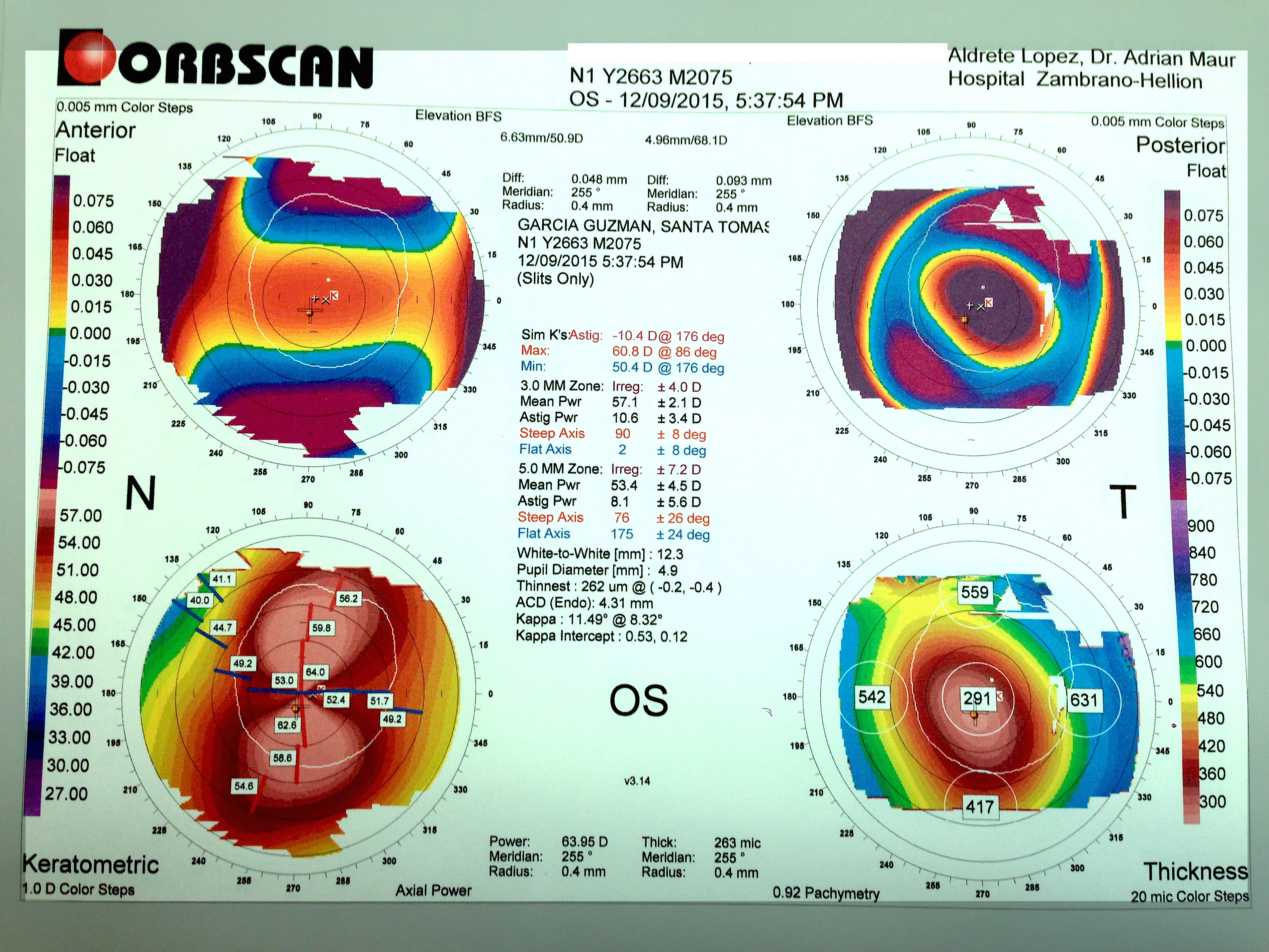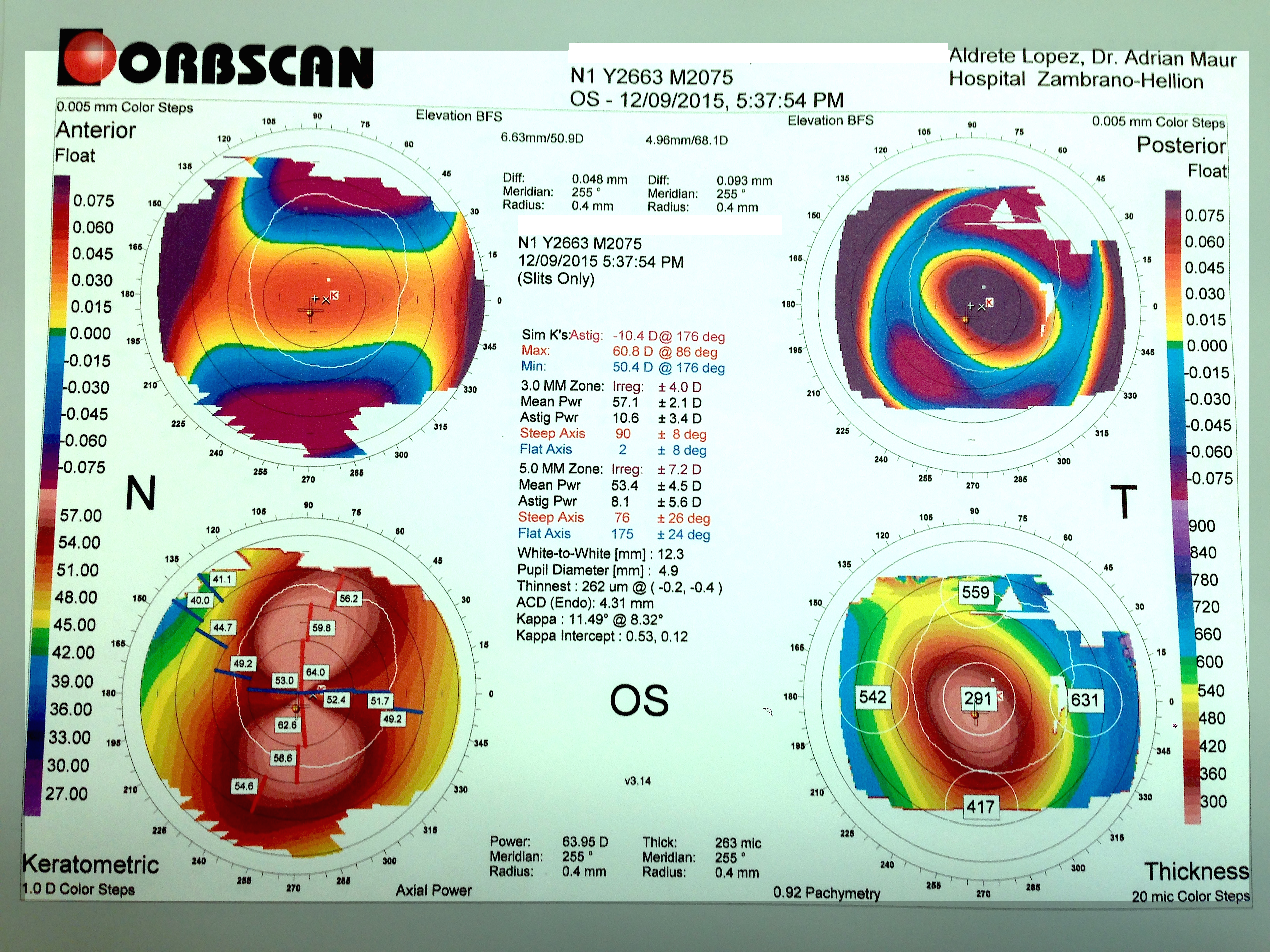 | current | 14:41, December 19, 2015 | 3,793 × 2,845 (17.88 MB) | Adrian.M.Lopez (talk | contribs) | Classic topographic pattern of keratoconus. 1. Increased area of corneal power surrounded by concentric areas of decreasing power. 2. Inferior-superior power asymmetry. 3. Skewing of the steepest radial axes above and below the horizonal meridian. | |