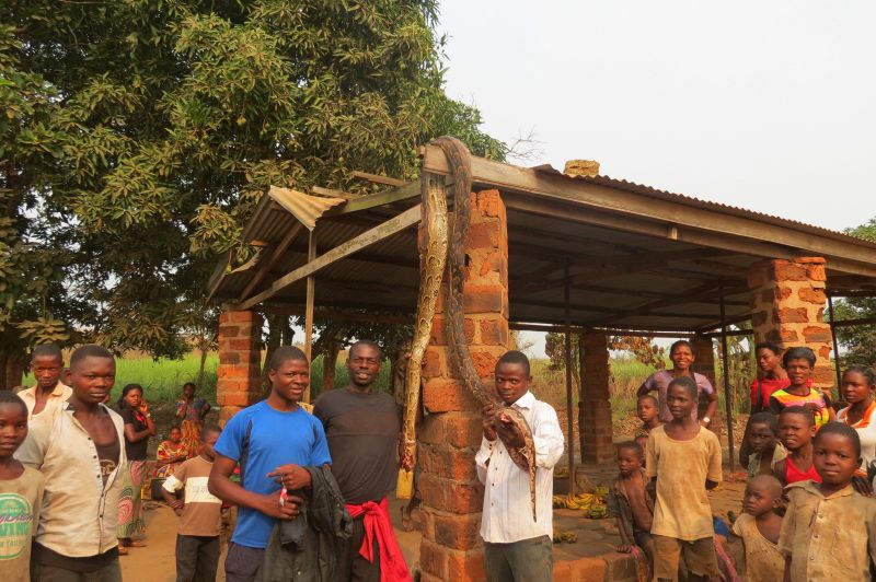 A specimen of Python Sebae (Central African Rock Python) sold at a bushmeat market near Kabinda (Lomami province, Democratic Republic of Congo): livestock meat is rare in this region, inhabitants rely thus on snakes and other bushmeat (monkey, bat, crocodile …) as a source of proteins. Courtesy: Dr R. Hardi.