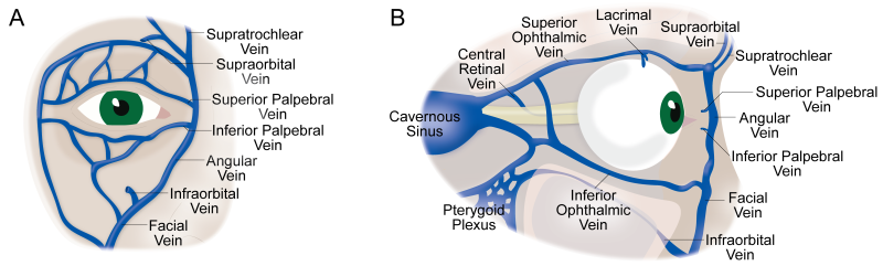 Orbital Veins, Figure 1A and 1B. Orbital veins with attention to the superior ophthalmic vein. Image drawn by Patrick J. Hunt, PhD.