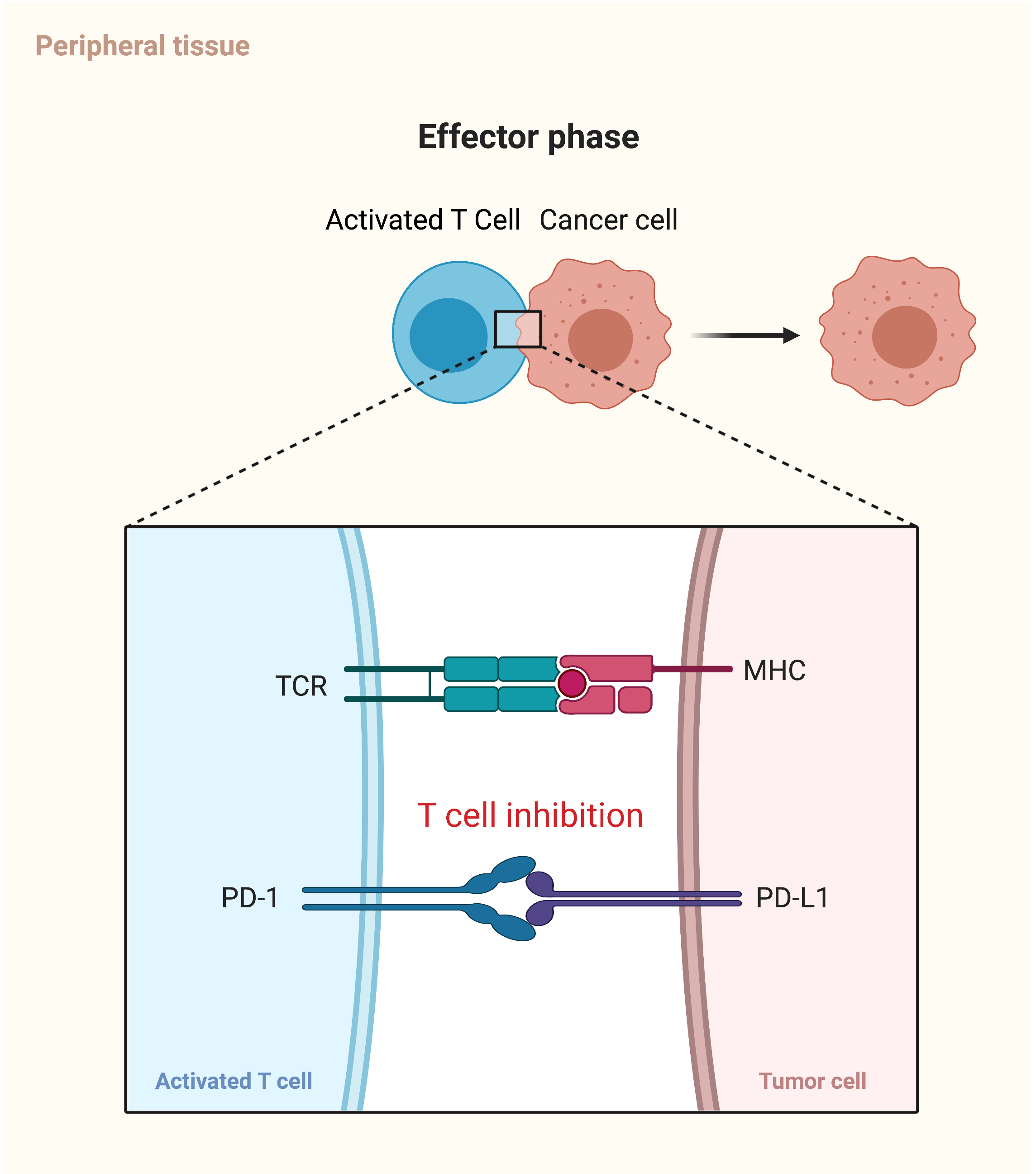 Within the peripheral tissue (effector phase): The activated T cell-cancer cell interaction - the T cell receptor-major histocompatibility complex provides an activating signal for cell death, but the presence of the programmed death 1 (PD1)- programmed death ligand 1 (PDL1) complex inhibits the T cell and the cancer cell is not triggered to undergo apoptosis.