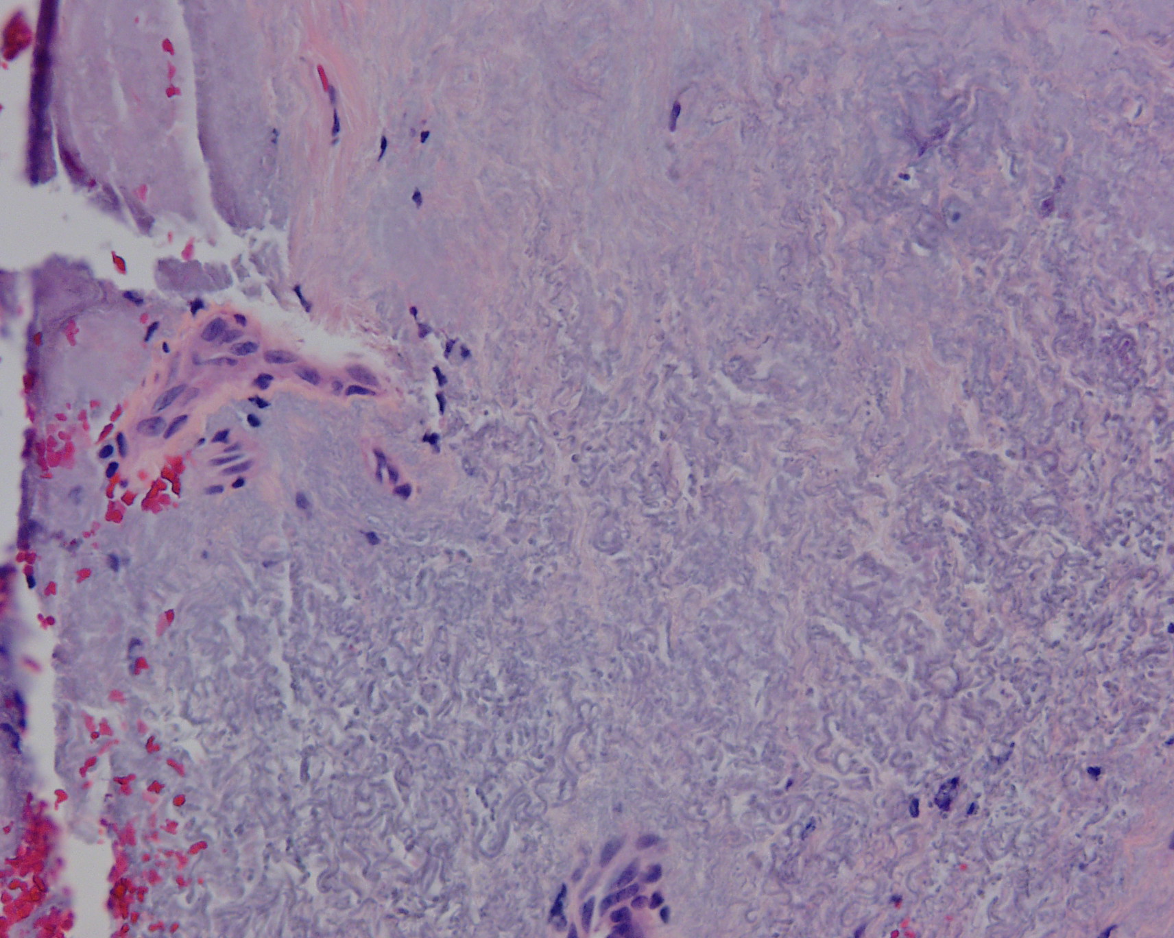 H&E stained pterygium specimen exhibiting the typical slate gray appearance with vermiform degeneration.
