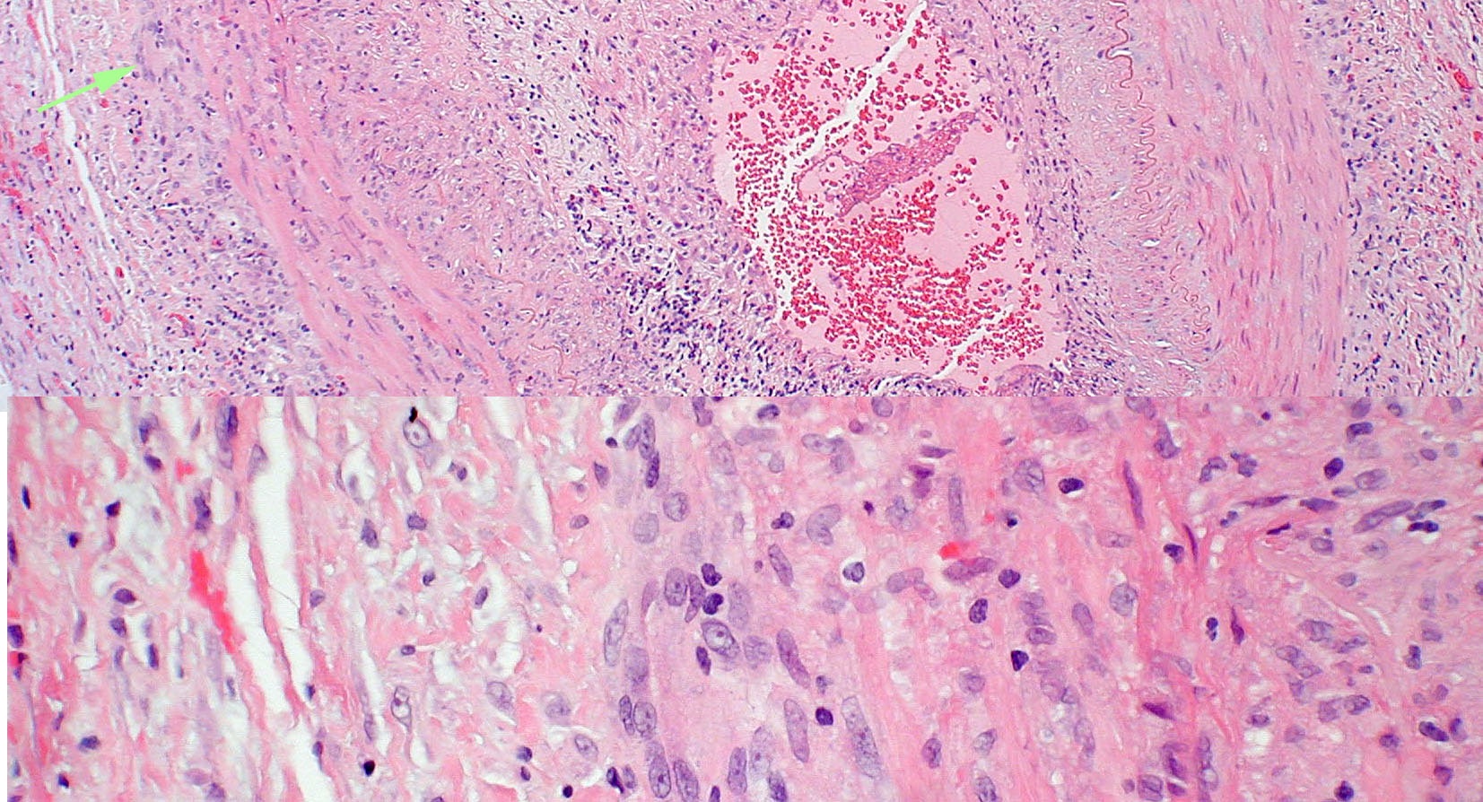Pathologic specimen from a patient with biopsy proven giant cell arteritis. Multi-nucleated giant cells (arrow) are present in the vessel wall. Photograph courtesy of Ben Glasgow, M.D.