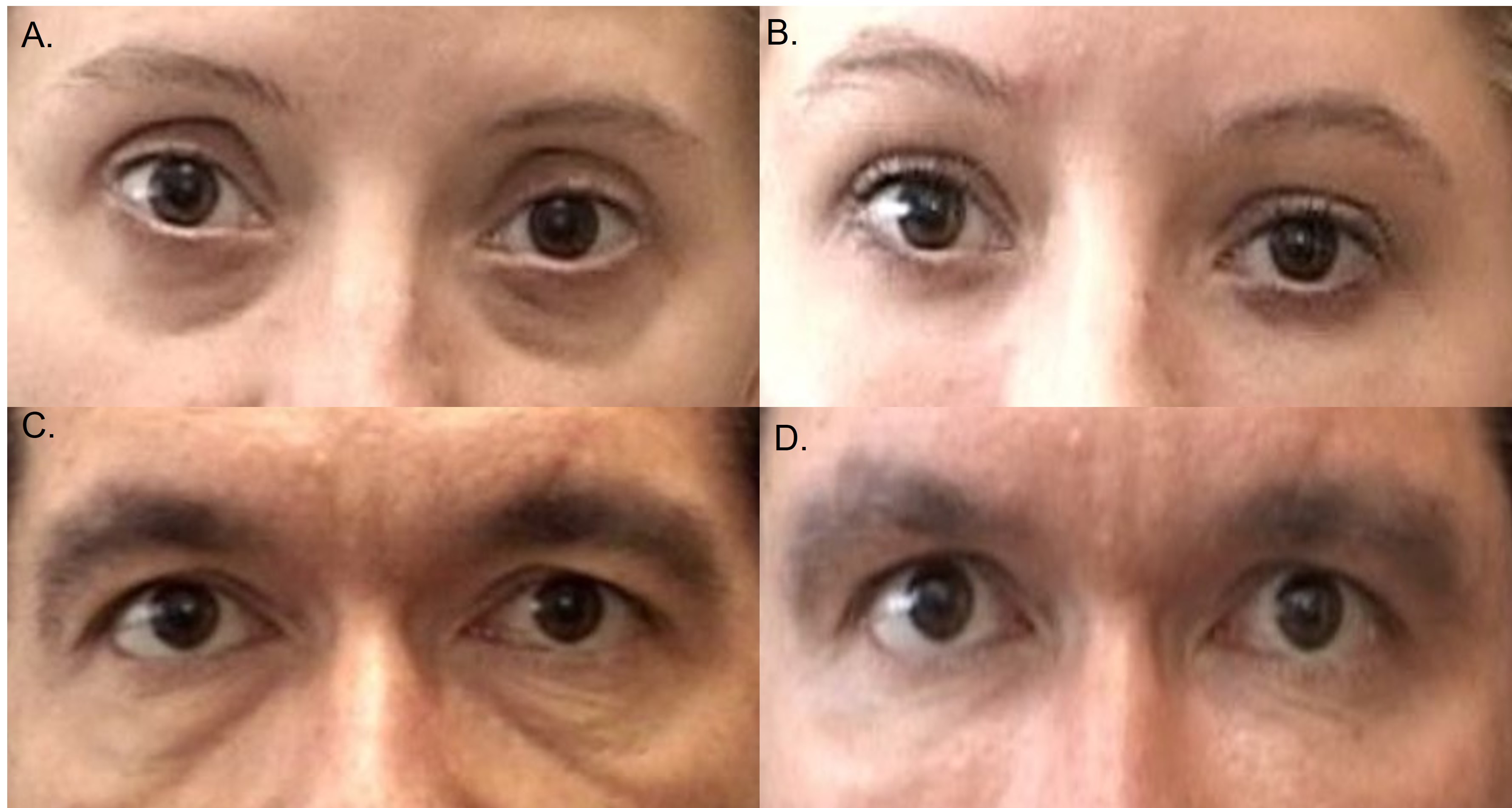 Figure 2: Tear through deformity treated with fat grafting. A, Pre-fat grafting of patient 1. B, Post-fat grafting of patient 1. C, Pre-fat grafting of patient 2. D, Post-fat grafting of patient 2.