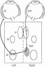 The partial adduction defect may be made clinically more apparent by performing horizontal saccades. There is adduction lag or reduced adducting saccadic velocity on the ipsilateral eye. The OKN drum also can reveal such a subtle reduction in adducting saccadic velocity. The defective input to the medial rectus subnucleus of CN III from the CN VI via MLF causes this ipsilesional adduction deficit or lag.