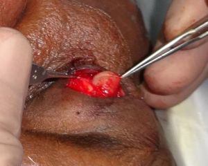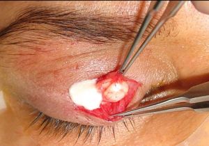 - ↑ Gologorsky D, Jakobiec FA, Freitag SK. Transconjunctival elimination of keratin from an intratarsal meibomian cyst. Ophthalmic Plast Reconstr Surg. 2013 May-Jun;29(3):e88-91. 250332.
