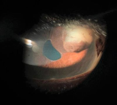 - En bloc excision - A more aggressive surgical approach is en bloc excision of the iris cyst with or without light cryotherapy. While this procedure has a good success rate, there is greater risk of causing collateral damage to ocular structures.[15]