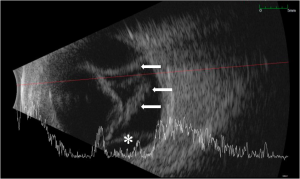 Visual acuity is usually poor and may be count fingers or worse in the setting of a subacute or chronic retinal detachment. Pupillary exam generally reveals a minimally reactive pupil as a result of near-complete or complete (360 degrees) posterior iris synechiae with central iris-lens apposition. Although hypotony is usually seen in these cases, the intraocular pressure may also be normal. Slit lamp examination may reveal a mild to moderate degree of intraocular inflammation characterized by corneal edema (microcystic edema or Descemet’s folds), anterior chamber reaction (cell and flare), and posterior iris synechiae. The anterior chamber is significantly deepened, and gonioscopy reveals a wide open angle due to retrodisplacement of the peripheral iris away from the angle (Figure 1A). The iris body is apposed to the anterior lens face with disappearance of the posterior chamber (Figure 1B). Cataract formation may also result as a consequence of aqueous diversion. Ciliochoroidal detachment or effusions may also be seen especially in the setting of hypotony. Fundus examination and B-scan ultrasonography typically reveal some combination of retinal detachment, choroidal detachment, or PVR if the condition is longstanding (Figure 2). [1][3]