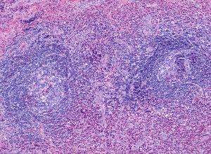 The subcutaneous lesions of Kimura’s disease are characterized by follicular hyperplasia with active germinal centers, as well as a proliferation of capillary and arteriolar vasculature, surrounded by concentric rings of reactive fibrosis composed of collagen and hyaline.[1][2][6] The follicles present in Kimura’s disease are usually well-formed, but tend to undergo degradation once infiltrated by eosinophils, at which point follicular capillary vascularization and eosinophilic microabscesses are commonly observed.[6] The vasculature present in Kimura’s disease is primarily composed of capillaries and arterioles with delicate walls and flat or cuboidal endothelium with typical nuclei.[6] The interfollicular zones are populated by numerous lymphocytes with prominent eosinophilia, although plasma cells and mast cells are also present.[6] In advanced Kimura’s disease affecting glandular tissues, normal glandular tissue is destroyed and replaced with fibrotic tissue and lymphocytic infiltrate.[6]
