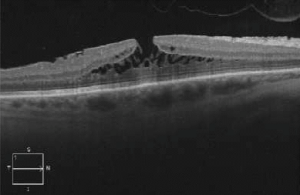 - Type 2: rupture of parafoveal cysts or schisis mainly from ERM;