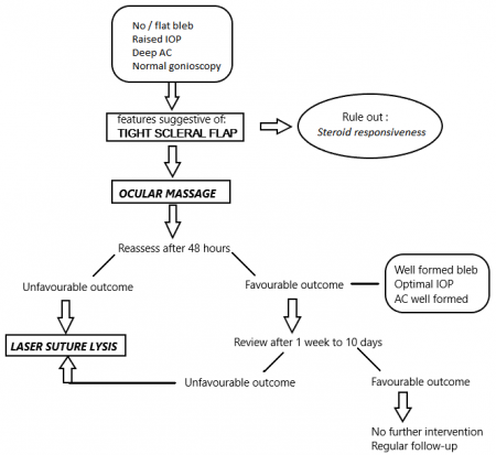Laser suture lysis constitutes an integral part of early postoperative management of ineffective aqueous drainage due to tight scleral closure. The fundamental procedure has remained simple despite some minor variations in laser systems and techniques. LSL gives the surgeon the liberty to tip his scale towards securing the scleral flap more tightly, thus avoiding the risk of hypotony and its associated complications. In addition to this, the adequacy of an office setting adds to its advantage. LSL can be done anytime between 4th day to 3 weeks postoperatively, with a liberty of delayed-release in trabeculectomy surgeries enhanced with antimetabolites. Though a simple procedure, the presence of hemorrhage or chemosis or fibrosed tenon’s capsule could make it difficult. Furthermore, it should be kept in mind that it is preferable to do sequential lysis, in-order to lower IOP gradually to the desired range. In conclusion, LSL is a simple office procedure to manage early postoperative increase in IOP risking bleb failure and should be considered a fairly good option not requiring any additional surgical skill.
