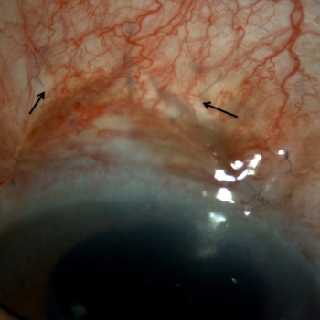 - If the overlying conjunctiva is injected, a drop of 2.5% phenylephrine can be used to cause vasoconstriction, thus allowing an optimum visualization of the underlying scleral sutures.