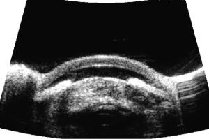 Phacomorphic Glaucoma is diagnosed by the presence of eye pain, history of decreased vision, evidence of mature cataract formation (slit lamp exam), angle closure (gonioscopy), and elevated intraocular pressure (applanation tonometry) in the affected eye. Distinguishing factors between primary angle-closure and phacomorphic angle-closure are presence of an intumescent cataractous lens and presence of cell and flare. Axial length measurement (usually short in phacomorphic) and records of the refraction may also be helpful in distinguishing between the two conditions .[2][4][5][6] In primary angle-closure the fellow eye has shallow anterior chamber, but in phacomorphic glaucoma the fellow eye usually has normal anterior chamber depth or pseudophakia. Ultrasound biomicroscopy (UBM) can assist in the diagnosis and may show a dense cataractous lens causing mass effect on the iris with anterior bowing and closed angles (Figure 1).