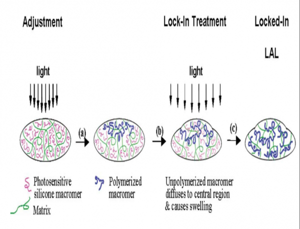 Light adjustability of the lens is based on the principles of photochemistry and diffusion. The LAL incorporates photosensitive molecules known as macromers embedded uniformly in a silicone matrix. When light (365 nm wavelength UV light) is directed to a specific area of the lens, macromers in the path of the light get activated and attach to the ends of other macromers forming polymers. This polymerization creates a concentration gradient between the irradiated region and the rest of the optic. Over a 12 hour period, the remaining unexposed macromers physically diffuse into the exposed area until there is no concentration gradient, causing an highly predictable change in the lens curvature and the refractive power change of the the lens. Light treatments can simultaneously be targeted to perform spherical and cylindrical adjustments. As long as there are untreated macromers further adjustments to refine the corrections can be made by directing light to different areas of the lens. When the adjustment process has been perfected to the satisfaction of the surgeon and the patient, the entire lens is exposed to the treatment light to polymerize all remaining macromers effectively locking them in place to prevent any further changes.