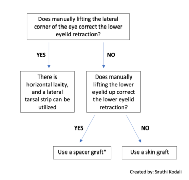 Retraction can first be managed with ocular lubricants, including artificial tears and ointments to temporarily treat the associated dry eye symptoms.[14] For a more permanent solution, a surgical approach is typically utilized. The following flow chart can be useful in determining which surgical approach to take for severe cases of lower eyelid retraction:
