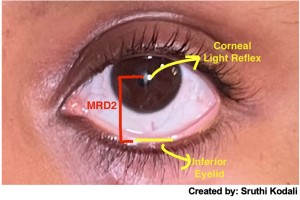Another method to quantify lower eyelid retraction is the margin reflex distance 2 (MRD2). With the patient’s and examiner’s eyes at the same level, the patient is directed to look at a light held directly in front of them.The distance between the corneal light reflex to the central portion of the lower eyelid is measured in millimeters (See Figure 1). [5] The MRD2 is typically less than 5.5 mm, so any distance greater is indicative of lower eyelid retraction. [4]