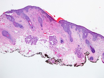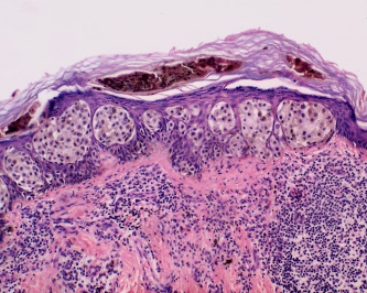 - Lentingo maligna melanoma - This is most common subtype seen on the eyelid skin, but is the least common overall. It is characterized by atypical, mostly spindle-shaped melanocytes at the basal epidermis and can also extend to adnexal structures. These often arise from sites of actinic damage and areas of solar elastosis. Lentigo maligna melanoma may also exhibit pagetoid growth that can ultimately involve all layers of the epidermis and invade vertically into the dermis.