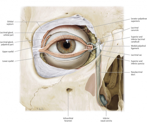 The upper and lower eyelid puncta overlie the canaliculi, which travel 2mm vertically, then 8 to 10mm horizontally and medially within the orbicularis oculi muscle. In >90% of individuals, the upper and lower canaliculi converge to form a common canaliculus (about 3 to 5mm long) before entering the posterolateral wall of the nasolacrimal sac.