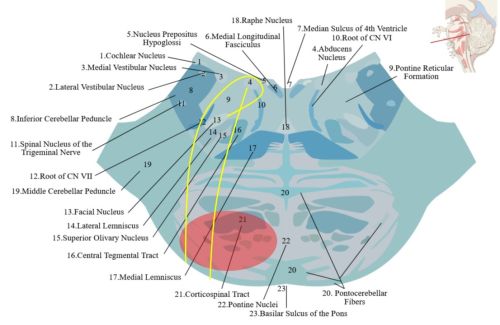 - ↑ 2.00 2.01 2.02 2.03 2.04 2.05 2.06 2.07 2.08 2.09 2.10 2.11 2.12 2.13 2.14 2.15 2.16 2.17 2.18 2.19 2.20 2.21 Sakuru R, Elnahry AG, Bollu PC. Millard-Gubler Syndrome. In:StatPearls [Internet]. Treasure Island (FL): StatPearls Publishing; 2023. https://www.ncbi.nlm.nih.gov/books/NBK532907/