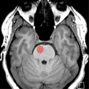 Figure 2: Location of damaged area (red circle) on a normal T1 weighted MRI in Millard-Gubler syndrome.[5] Adapted from case courtesy of Frank Gaillard. https://radiopaedia.org/?lang=us. Radiopaedia.org. From the case https://radiopaedia.org/cases/14278?lang=us. rID: 14278. Used under CC BY-NC-SA 3.0 https://creativecommons.org/licenses/by-nc-sa/3.0/, via Radiopaedia