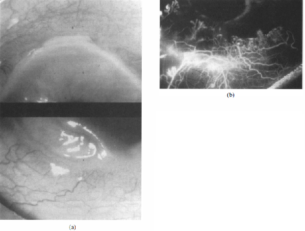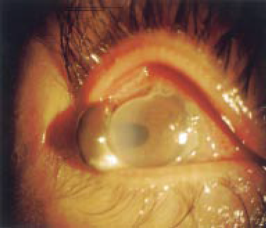 Watson and colleagues classified the disease into three types based on clinical features, anterior segment fluorescein angiographic findings, and treatment response.[1] The first type, unilateral Mooren’s ulceration (figure 4), is excessively painful and occurs in patients >60 years old. Affected eyes are seen to be red and congested, but inflammation does not extend beyond 3 mm from the limbus. Vascularization of the ulcer bed is seen along with leakage at the tips of these new vessels. Ulceration extends around the globe and often leaves a thick, opaque central cornea. The central corneal stroma eventually is removed completely and a thin layer of scar tissue remains overlying an intact endothelium and covered by an epithelium derived from the conjunctiva. When the stroma disappears, the pain subsides. If scar tissue retracts to the point where Descemet’s membrane is exposed, the same process will likely recur if a corneal transplant is performed [1]. Anterior segment fluorescein angiography shows venular occlusion of local episcleral and conjunctival blood vessels along with disruption of the limbal arcade and vascular leakage from deep vessels at the limbus and base of the ulcer. In addition, the vaso-obliteration of superficial vascular networks is characteristic of unilateral Mooren’s ulceration.