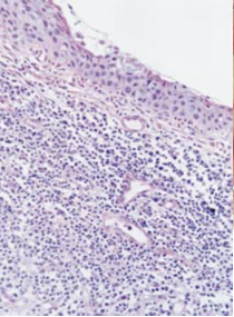 On histological examination (figure 2), samples of conjunctival and corneal specimens show a lymphocytic infiltration along with neutrophils, eosinophils, plasma cells, and mast cells [4],[18] . High levels of proteolytic enzymes have been found in affected conjunctival tissue [18]. When the limbal cornea is examined, it can show vascularization and infiltration of plasma cells and lymphocytes into the superficial stroma in addition to the destruction of the collagen matrix [4]. The midstroma may show disorganized collagen lamellae and hyperactive fibroblasts, while the deep stroma contains a macrophage infiltrate. The leading edge of the ulcer can show neutrophilic infiltration with evidence of degranulation. Adjacent conjunctiva may show a hyperplastic epithelium and subconjunctival lymphocytic and plasma cell infiltration [4]. It has also been shown that elevated NF-κB activity may be responsible for the pathology.[19]