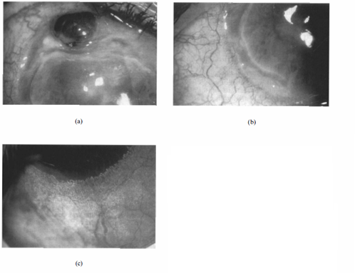 The diagnosis of Mooren's ulcer requires the absence of any ocular infection or systemic rheumatological diseases known to cause peripheral corneal ulceration [3]. Srinivasan and colleagues described three patterns of ulceration: partial peripheral, complete peripheral, and total corneal ulceration (Figure 3). In complete peripheral ulceration, the disease process has completely encompassed the corneal periphery, leaving behind a “central island of cornea” often opacified (Figure 3b). In total corneal ulceration, the corneal stroma has been completely replaced with a fibrovascular membrane (Figure 3c). Partial peripheral ulceration can be subdivided into nasal, temporal, superior, and inferior ulceration, of which temporal and nasal (the so-called intrapalpebral cornea) involvement is more common [3].