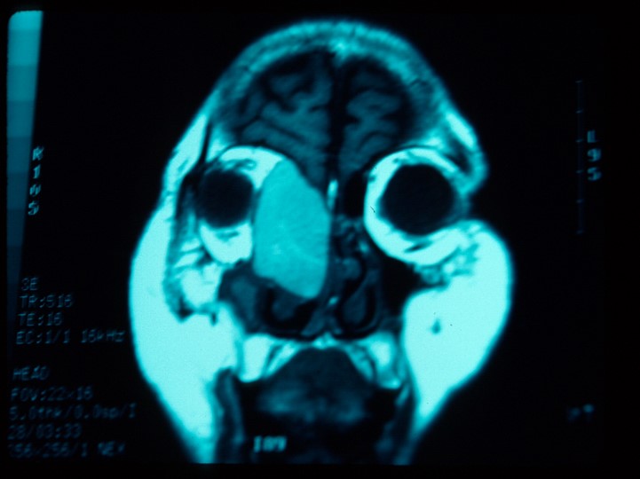 Diagnosis is primarily made via imaging. Both computed tomography (CT) and magnetic resonance imaging (MRI) can be utilized to aid in diagnosis. The appearance of mucoceles on imaging can be variable depending on whether the mucocele contents are inspissated or hydrated.[15] . CT is helpful in assessing sinus pathology and extent of bone erosion. A mucocele is most commonly isodense with the brain. Contrast enhancement of the lesion on CT suggests infection. MRI is helpful in assessing the extent of the lesion and in differentiating the lesion from other soft tissue tumors. Most commonly, the lesion appears with low intensity signal on T1-weighted sequence with possible peripheral enhancement and with high intensity on T2-weighted sequence.[2] Lesions with inspissated contents have low intensity signal in T1-weighted and T2-weighted sequences while hydrated or proteinaceous contents will show high intensity signal in T1- and T2-weighted sequences.[15]