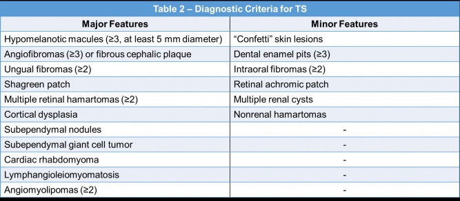 A diagnosis of TS can be made based on clinical features, genetic testing, or a combination of both[12]. The clinical criteria for the diagnosis of TS is displayed in Table 2[12][49]. A definite clinical diagnosis requires two major features or one major and two or more minor features[12].