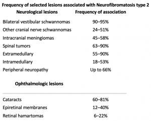 Ocular manifestations are much less common in NF2 than NF1. Optic nerve sheath meningiomas are a characteristic tumor type seen in NF2, in contrast to the optic pathway gliomas seen in NF1[31]. Other common findings include cataracts, hamartomas of the retina and retinal pigment epithelium, strabismus, amblyopia, and extra-ocular movement abnormalities[5][31]. NF2 is characterized by bilateral vestibular schwannomas. These lesions of the eighth cranial nerve can produce adjacent fifth, sixth, or seventh nerve dysfunction that can produce ocular symptoms and signs (e.g, facial numbness, pain, diplopia, exposure keratopathy).