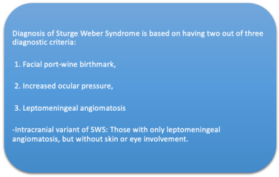 Sturge-Weber syndrome (SWS) is a sporadic congenital neurocutaneous syndrome that is characterized by a facial cutaneous hemangioma (port-wine stain) involving the skin in the trigeminal nerve territory[3][5]. The “port-wine stain” is often associated with an ipsilateral capillary-venous vascular malformation of the leptomeninges[9]. SWS has an estimated incidence between 1 in 20,000 and 50,000 live births[3][9]. It is hypothesized that SWS is the result of a somatic mutation in the GNAQ gene, with clinical manifestations differing depending on the timing and location of the mutation in the embryo[3]. Studies have suggested that port-wine stains that involve an entire V1 segment are commonly associated with underlying ophthalmic and neurologic involvement, and could be used as an initial sign to prompt further assessment[16].