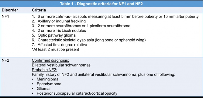 NF2 is also diagnosed with clinical criteria (see Table 1), however the diagnosis of NF2 is sometimes more difficult than NF1 due to the lack of cutaneous symptoms[7]. Neuroimaging might show the characteristic bilateral vestibular schwannoma of NF2. Genetic testing is also available for NF2 and can detect more than 90% of mutations[7].