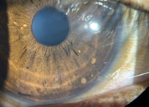 Lisch nodules are the most common ocular manifestation in NF1, and they are generally not found in patients with NF2[5]. Iris Lisch nodules are melanocytic hamartomas that are asymptomatic and tend to appear in late childhood[7]. They appear as small (<1-2 mm), dome-shaped, tan-dark brown pigmented on the iris, commonly on the inferior portion[3]. The prevalence of Lisch nodules is only 5% in children with NF1 under the age of 3, however the prevalence rises to 42% at the age of 3-4, 55% at ages 5-6, and 100% in adults over the age of 21[23].