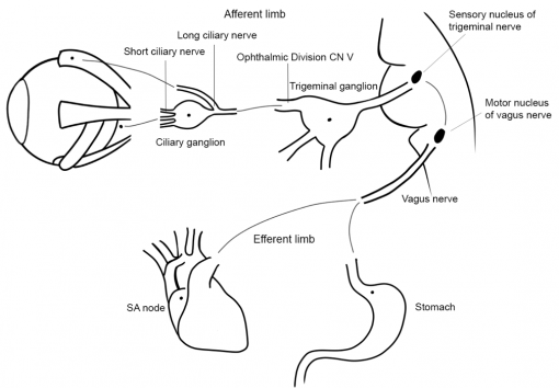 The OCR arc is comprised of an afferent limb (carried by the trigeminal nerve (CN V)) and an efferent limb (carried by the vagus nerve (CN X)). The reflex begins with the activation of stretch receptors in periorbital and ocular tissues. The long and short ciliary nerves carry the impulses to the ciliary ganglion, where the ophthalmic division of CN V carries the impulses to the Gasserian ganglion, and subsequently to the trigeminal nucleus. The afferent nerves synapse with the visceral motor nucleus of the vagus nerve in the reticular formation of the brain stem, where the impulses are then carried to the myocardium to activate the vagal motor response at the sinoatrial (SA) node, resulting in bradycardia.[5]