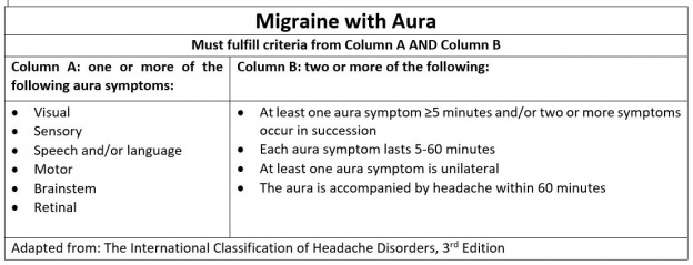 - ↑ 3.00 3.01 3.02 3.03 3.04 3.05 3.06 3.07 3.08 3.09 3.10 3.11 3.12 3.13 3.14 3.15 3.16 3.17 3.18 3.19 3.20 3.21 3.22 3.23 3.24 Schwartz DP, Robbins MS. Primary headache disorders and neuro-ophthalmologic manifestations. Eye and Brain. 2012; 4:49-61. doi:10.2147/EB.S21841.