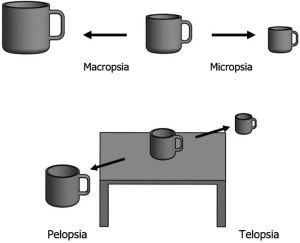 Less common visual manifestations include visual hallucinations, illusions, distortions, and persistent positive visual phenomena. Hallucinations and illusions as a sequela of migraines can present as distorted perception of size, movement, or general characteristics of images, without disturbances in language or motor activity. Specifically, patients may retain an image of an object that is no longer in the field of view, a condition referred to as palinopsia. It is more common in patients who experience migraine with aura compared to migraines without aura.[3] In contrast, a more continuous visual disturbance is persistent positive visual phenomena, or visual snow. Visual snow consists of diffuse small particles, such as TV static, rain, dots, etc. in the total visual field that can persist for years.[1][8] Visual snow is the pathognomonic characteristic of visual snow syndrome (VSS), of which, 60% of patients experience comorbid migraines with or without aura .[9][10] A less prevalent, but possible complication of migraine includes Alice in Wonderland Syndrome (AIWS). Common visual symptoms of Alice in Wonderland Syndrome include pelopsia, telopsia, micropsia, macropsia, and hallucinations. Patients may also experience perceptual disturbances such as microsomatognosia or macrosomatognosia [Figure 2], depersonalization, or auditory hallucinations.