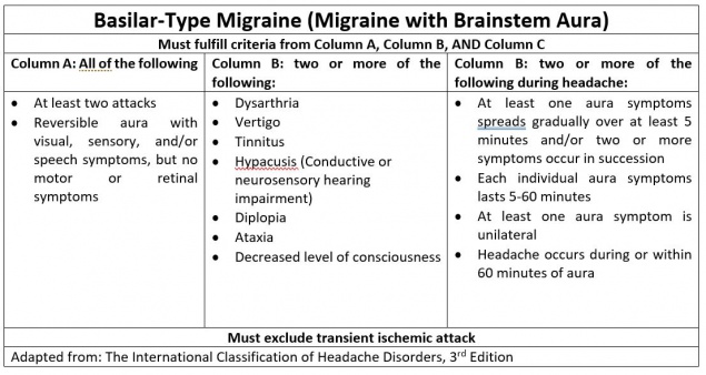 - Basilar-type migraine, or migraine with brainstem aura, is defined as a headache with neurological symptoms localized to the brainstem (i.e. dizziness, ataxia, tinnitus, hearing loss, syncope, etc.). A typical aura in both the temporal and nasal hemifields may be present, accompanied by diplopia.