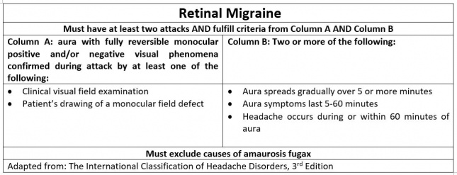 Retinal migraine presents with reversible monocular visual loss, "C" shape, colored, scintillating and expanding scotomas, and typically presents in patients with a history of migraine with aura.[3] Diagnosis requires at least two episodes of reversible monocular visual disturbances confirmed by clinical visual field examination or patient documentation of a monocular field defect. These episodes must develop over at least five minutes, last under an hour, and occur alongside or within 60 minutes of a migraine headache. Retinal migraine remains a diagnosis of exclusion after ruling out serious causes of transient monocular vision loss (TMVL) such as amaurosis fugax, carotid artery disease, or giant cell arteritis.[5] [22]
