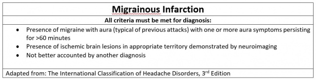 A rare but serious complication associated with migraine aura is migrainous infarction. Migrainous infarction is defined by the International Headache Society (IHS) as the presence of migraine aura symptoms associated with ischemic brain lesion(s), typically in the posterior circulation. A visual aura that resolves within minutes to hours is the most common symptom that occurs prior to an acute migrainous infarct.[6] Although a direct causative link has not been identified, an increased frequency of migraine attacks is correlated with an increased risk of ischemic stroke.[7]
