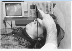 2) Axial plane: apply the transducer gently on the eye with your fourth and fifth fingers resting on the patient’s nose.