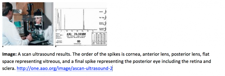 - ↑ 3.0 3.1 3.2 3.3 Waldron, R.G. A-Scan Biometry. http://emedicine.medscape.com/article/1228447-overview.