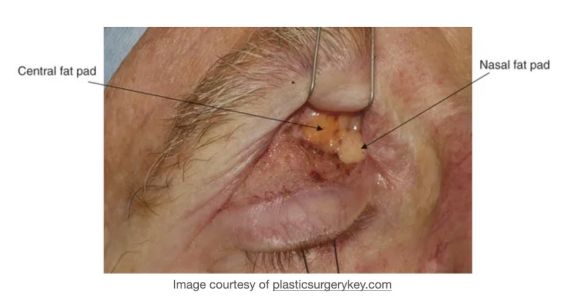 The upper lid nasal fat pad is white in color while the central fat pad is yellow. The richer yellow hue of the upper lid central fat pad can be attributed to its higher concentration of carotenoids such as beta-carotene and lutein [7]. The white nasal fat pad contains more fibrous tissue and is derived from neuroectoderm, while the yellow central fat pad is sparsely vascularized and derived from mesoderm. Carotenoids are known antioxidants, though their role in this location has not yet been defined[7]. The difference in color between these two upper lid fat pads stems from their different carotenoid contents, vascularity, and embryological origins. The vast majority of research is focused on the upper eyelid fat pads, possibly owing to its abundance and accessibility during routine upper eyelid blepharoplasty.
