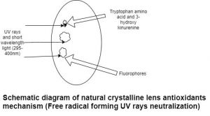 Lens receives O2 from the aqueous humor. Glucose metabolized in the lens through different pathways like anaerobic glycolysis, Krebs cycle, hexose monophosphate shunt, sorbitol pathway. These cellular activities produce reactive oxygen species. Sunlight absorbed by photosensitizer undergoes photoexcitation (photoexcited singlet state converted into intermediate excited triplet state). This triplet state allow for interaction with another molecule to produce ROS. Antioxidants such as glutathione peroxidase, catalase, superoxide dismutase, and ascorbate present in lens epithelium and fibers. [2]Glutathione peroxidase neutralizes hydrogen peroxide and lipid peroxide. Ascorbate present in outer layers of lens reacts with superoxide, peroxide, hydroxyl ion and produces dehydroascorbate product. Ascorbate also scavenges singlet oxygen and thiol radical.[11] Aromatic amino acid (Tryptophan), fluorophores and 3-hydroxykinurenine provide protection against UV rays in the lens. (Fig.1)