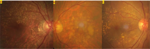 The term “pachydrusen” was introduced by Spaide (2018) to describe pachychoroid-associated drusen.[1] Such lesions differed in both appearance and distribution of soft drusen, a common finding in non-exudative AMD. Pachydrusen are large (typically >125 µm), sub-RPE deposits that are yellow-white in color. Additionally, the deposits are distributed across the posterior pole and are isolated or clustered in small groups. The deposits appear with irregular, complex shapes but have distinct borders. Another important distinguishing feature is that these drusenoid lesions are associated with the presence of thickened choroid.