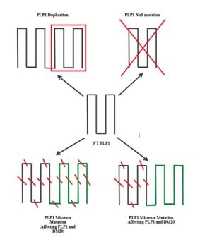 Null mutations, those that result in premature stop codons and shortened protein products, do not accumulate in the ER, resulting in far fewer oligodendrocyte casualties.[1] However, decreased myelin production has been observed in individuals with a null mutation. Therefore, the end product of this mutation is a mild phenotype. Individuals with deletion mutations share a similar phenotype with a similar underlying mechanism. However, missense mutations result in the most severe presentation because they lead to eventual oligodendrocyte apoptosis and axonal injury. Mutations in DM20, a protein isoform in close proximity to PLP1, also play a key role in determining disease severity.